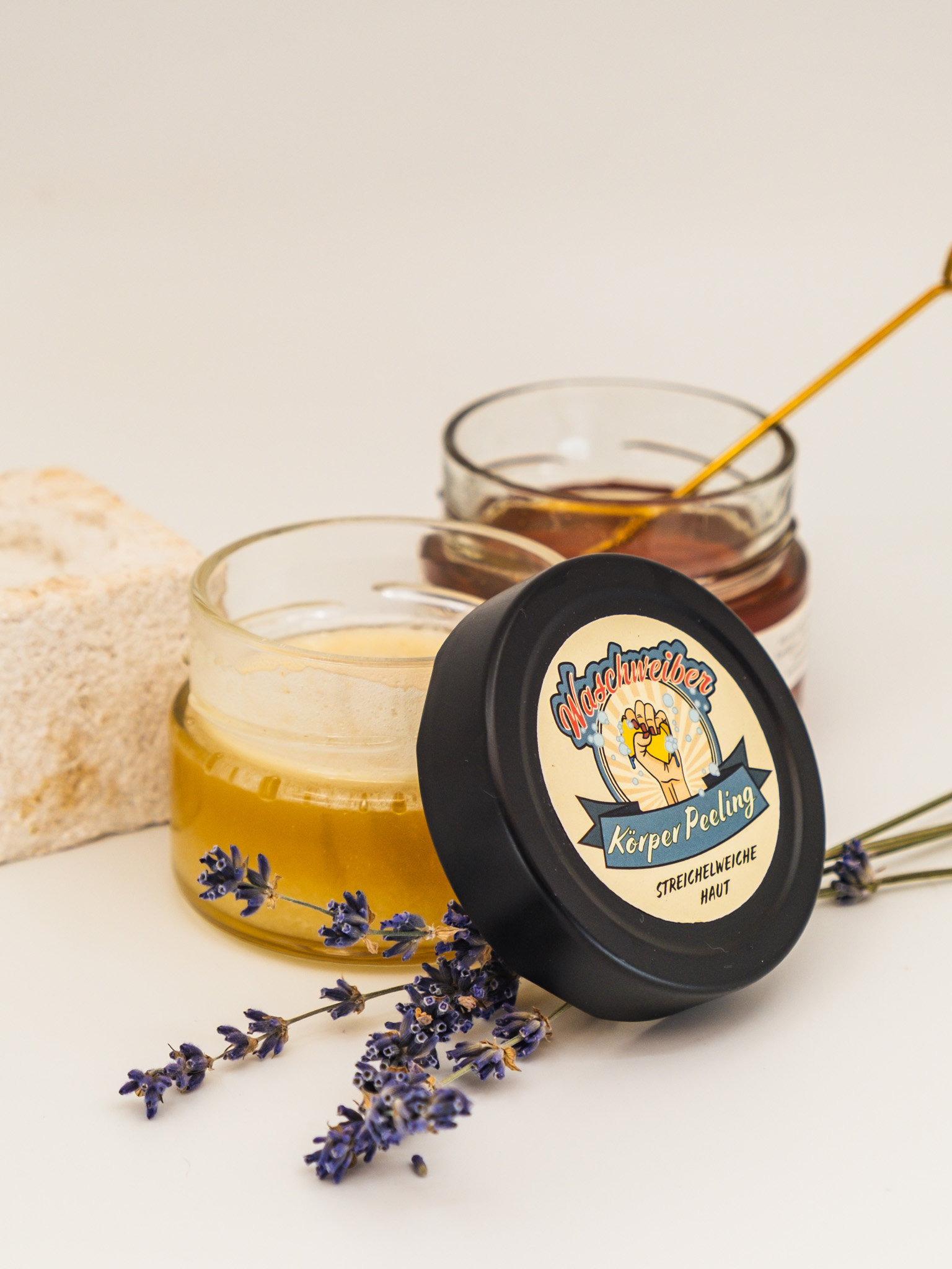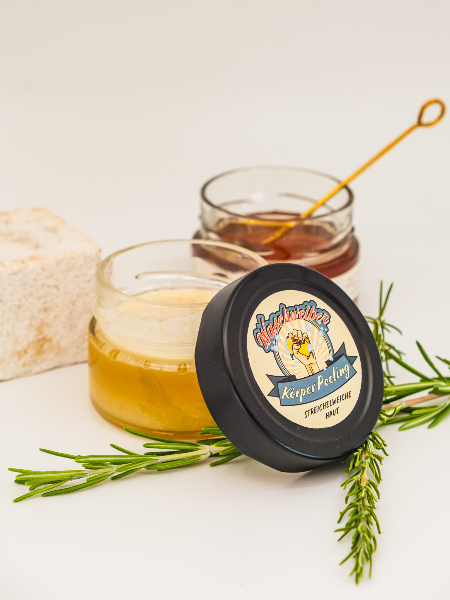 Dieses handgemachte Körperpeeling wird von den Waschweibern mit viel Sorgfalt hergestellt. Es vereint die pflegenden Eigenschaften unseres Honigs mit natürlichen Peelingkörnern und hochwertigen Pflanzenölen. Wähle zwischen der entspannenden Variante mit Lavendel oder der belebenden mit Rosmarin. Beide schenken der Haut ein glattes, gepflegtes Gefühl und einen natürlichen Duft.